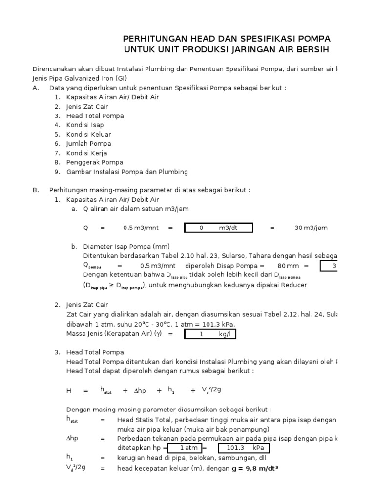 Contoh Soal Menghitung Daya Pompa Dikdasmen from i0.wp.com Rumah tangga, industry, pertambangan ,dll. 3 bab 3 pompa sentrifugal 3.1.kerja pompa sentrifugal pompa digerakkan oleh motor, daya dari motor diberikan kepada poros pompa untuk memutar impeler yang dipasangkan pada poros tersebut. Pada tanggal 1 januari 2016, pt abc mengimpor barang dari jerman dengan harga faktur us$100.000. Berikut ini adalah contoh diagram pemilihan pompa standar. (pompa sentrifugal) no.1 sebuah pompa sentrifugal mengeluarkan air pada kecepatan 110 liter/s pada kecepatan 1450 rpm dengan head 23 meter. Kincir ini berputar sebanyak 5 putaran setiap menit. Untuk mengetahui suatu perhitungan yang baik bagi pompa, maka harus diketahui terlebih dahulu perhitungan data awal bagi pompa yang akan digunakan. Apabila terdapat kesalahan tanda, simbol, huruf maupun angka dalam perhitungan mohon dimaklumi.
